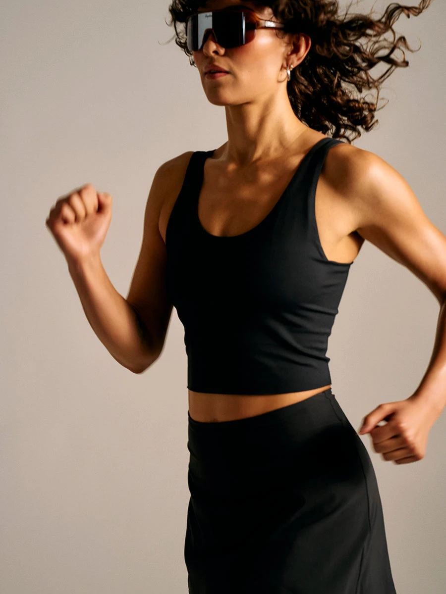 A medium support, close-to-body cropped tank made in our top-notch cooling technology fabric, CoolForm. This tank features a built-in shelf bra with removable pads, back elastic loop with reflective details, and a raw cut hem, increasing that comfortable fit.