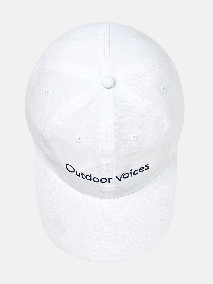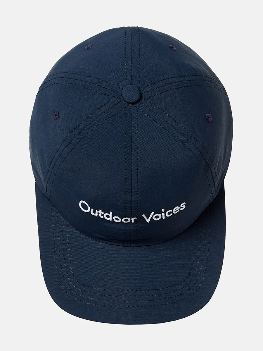 Lightweight hat with Outdoor Voices logo. 100% Recycled Polyester
