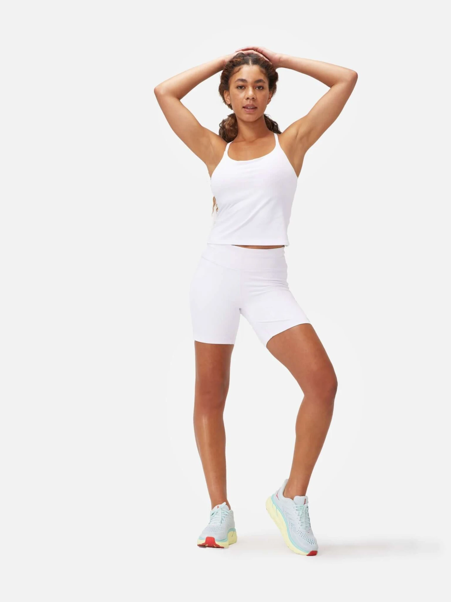 This tank features a built-in shelf bra, removable pads, and adjustable straps. Made in lightweight, breathable TechSweat with a slightly cropped fit.